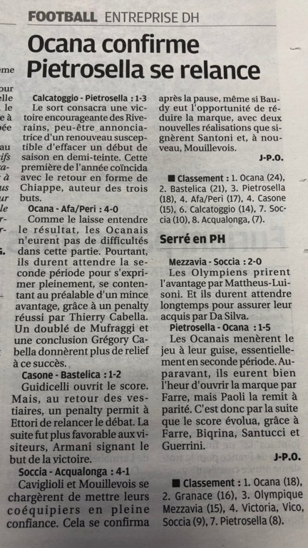 A lire dans le corse matin de ce jour. Ocana confirme en DH et PH et affine sa préparation pour la rencontre de coupe Nationale Football Entreprise face au CHU de TALENCE.