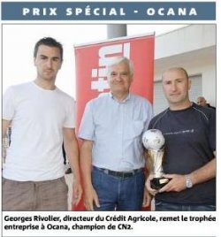 Lors de ce samedi 2 Juillet avait lieu, au complexe municipal d'AFA, la 36ème édition des trophées CORSE MATIN. A cette occasion, l'équipe Ocanaise, représentée par son président Joseph Santelli et son entraineur, Jérome Guiot, était récompensée d'un prix spécial, pour la magnifique saison réalisée. (champion de france CN2, Champion de Corse DH, Vainqueur de la Coupe de Corse). Maintenant le plus dur reste à faire pour conserver ces trophées lors de la saison 2011-2012.