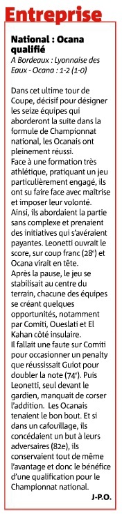 Les visiteurs enlevaient la victoire ! LA LYONNAISE quittait la compétition avec les honneurs !!! Parvenir en seizièmes de finale est déja une bonne performance.