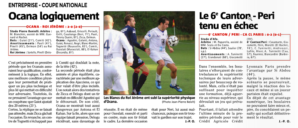 La deuxième période était totalement différente, avec la pression des Ajacciens, bien maitrisée malgré tout par les Ocanais, et sans être tellement dangeureux, les hommes du président SANTELLI, étaient à la limite de la rupture sur un centre repris astucieusement par ZICCA, qui voyait la cadre se dérober devant lui. Par la suite, on notait une frappe splendide de OUESLATI de 30 mètres, qui méritait mieux que de trouver la barre transversale, et quelques contres attaques mal gérées par les locaux.